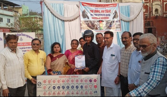 बुरहानपुर (अकील ए आज़ाद) यातायात सप्ताह के अंतर्गत ताप्ती सेवा समिति, एवं यातायात पुलिस थाना, बुरहानपुर के संयुक्त तत्वावधान में शहर के मुख्य चौराहा शनवारा पर ताप्ती जल की पुजा कर सड़क सुरक्षा जागरूकता कार्यक्रम प्रारंभ किया गया। कार्यक्रम का मुख्य उद्देश्य आमजन में सड़क सुरक्षा के प्रति जागरूकता बढ़ाना एवं यह संदेश देना कि एक सेकंड की असावधानी, पूरी ज़िंदगी पर भारी पड़ सकती है। इस अवसर पर यातायात संकेत पहचान प्रतियोगिता का आयोजन किया गया जिस में प्रतिभागियों ने सक्रिय सहभागिता करते हुए उत्कृष्ट प्रदर्शन किया। प्रतियोगिता के विजेताओं को पुष्पगुच्छ भेंट कर सम्मानित किया गया। साथ ही, हेलमेट पहनकर वाहन चलाने वाले जिम्मेदार वाहन चालकों को प्रशस्ति पत्र प्रदान कर सम्मानित किया गया, ताकि समाज में सकारात्मक संदेश पहुंचे और अन्य लोग भी सुरक्षा नियमों का पालन करने के लिए प्रेरित हों। कार्यक्रम में ताप्ती सेवा समिति की अध्यक्ष सरिता राजेश भगत, उपाध्यक्ष प्रेमलता साकले, सचिव धर्मेंद्र सोनी, राजीव खेड़कर, अभय रियाज उल हक अंसारी, इकबाल अंसारी, विजय राठौड़ सहित अन्य सदस्य उपस्थित थे। यातायात थाना सूबेदार एवं उनकी टीम की विशेष उपस्थिति रही। कार्यक्रम के माध्यम से नागरिकों को सुबेदार राजेश बरवाल ने यह संदेश दिया कि यातायात नियमों का पालन केवल कानूनी बाध्यता नहीं, बल्कि स्वयं एवं परिवार की सुरक्षा की जिम्मेदारी है।
