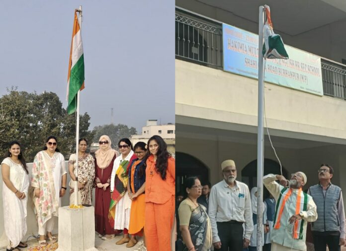 बुरहानपुर (अकील ए आज़ाद) 77 वें गणतंत्र दिवस पर हकीमया हाई स्कुल एवं कदरिया गर्ल्स स्कुल-कदरिया प्रायमारी स्कुल मे मुख्य अतिथि तफज्जुल हुसैन मुलायमवाला ने ध्वजा रोहण कर सलामी दी 77 वें गणतंत्र दिवस के अवसर पर कार्यकम को सम्बोधित करते हुए मुख्य अतिथि तफज्जुल हुसैन मुलायमवाला ने अपने विचार रखते हुए कहा की हम बहुत सौभाग्य शाली है जो हम दुनिया के सबसे बड़े गणतंत्र का हिस्सा है भारत पुरे विश्व मे अपनीसंस्कृति- एकता और भाईचारे के लिए जाना जाता है बाबा साहब अम्बेडकर जी के द्वारा लिखे संविधान को 1950 में लागू किया गया तब से भारत गणराज्य देश बना भारतीय सविधान समानता और न्याय का आधार है। कार्यक्रम मे स्कूली बच्चों द्वारा देशभक्ति से प्रेरित मनमोहक प्रस्तुतिया दी गई जिनका सभी ने जोरदार उत्साह वर्धन किया।